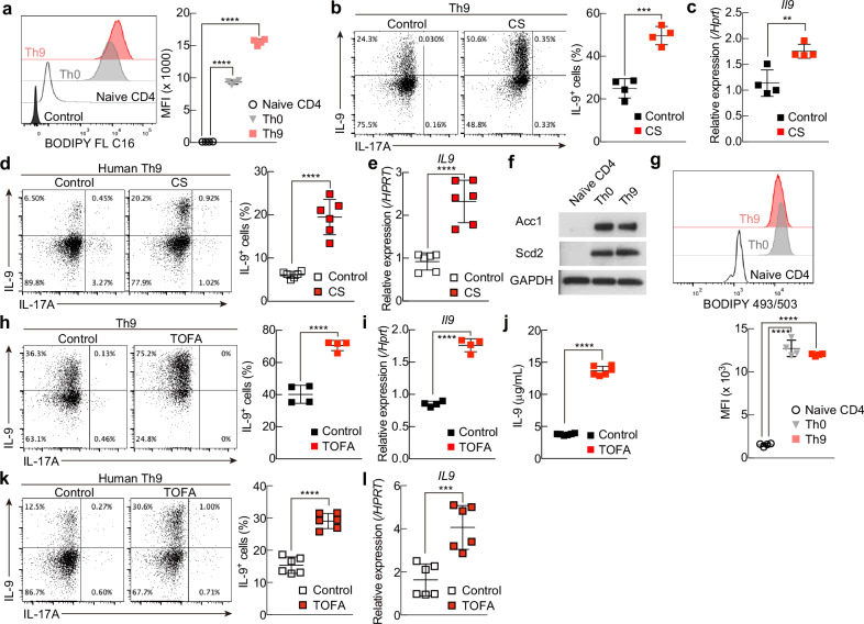 T helper 9 (Th9) cells are interleukin 9 (IL-9)-producing cells that have diverse functions ranging from antitumor immune responses to allergic inflammation. Th9 cells differentiate from naïve CD4+ T cells in the presence of IL-4 and transforming growth factor-beta (TGF-β); however, our understanding of the molecular basis of their differentiation remains incomplete. Previously, we reported that the differentiation of another subset of TGF-β-driven T helper cells, Th17 cells, is highly dependent on de novo lipid biosynthesis. On the basis of these findings, we hypothesized that lipid metabolism may also be important for Th9 cell differentiation. We therefore investigated the differentiation and function of mouse and human Th9 cells in vitro under conditions of pharmacologically or genetically induced deficiency of the intracellular fatty acid content and in vivo in mice genetically deficient in acetyl-CoA carboxylase 1 (ACC1), an important enzyme for fatty acid biosynthesis. Both the inhibition of de novo fatty acid biosynthesis and the deprivation of environmental lipids augmented differentiation and IL-9 production in mouse and human Th9 cells. Mechanistic studies revealed that the increase in Th9 cell differentiation was mediated by the retinoic acid receptor and the TGF-β-SMAD signaling pathways. Upon adoptive transfer, ACC1-inhibited Th9 cells suppressed tumor growth in murine models of melanoma and adenocarcinoma. Together, our findings highlight a novel role of fatty acid metabolism in controlling the differentiation and in vivo functions of Th9 cells.
