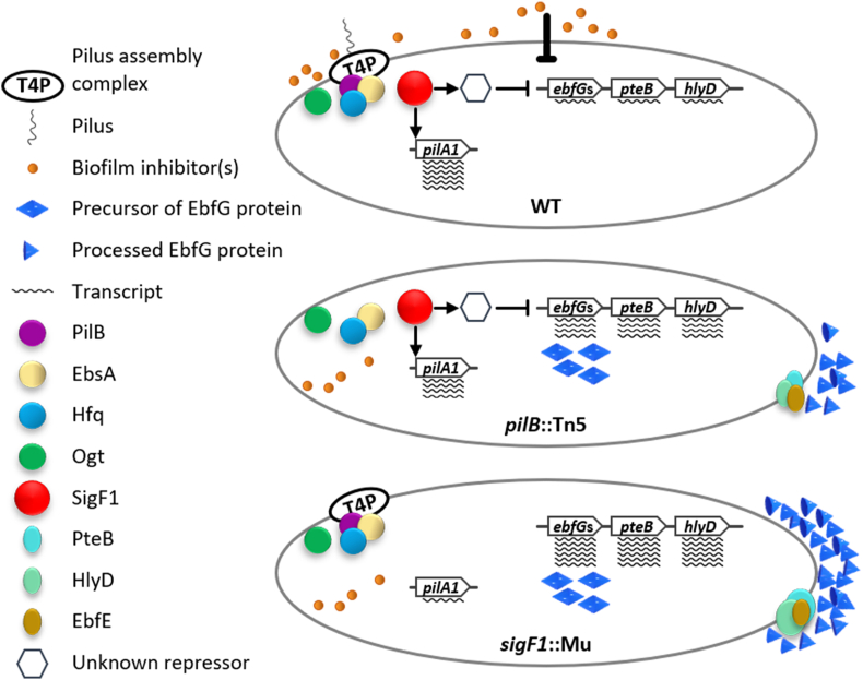 Cyanobacteria frequently constitute integral components of microbial communities known as phototrophic biofilms, which are widespread in various environments. Moreover, assemblages of these organisms, which serve as an expression platform, simplify harvesting the biomass, thereby holding significant industrial relevance. Previous studies of the model cyanobacterium Synechococcus elongatus PCC 7942 revealed that its planktonic growth habit results from a biofilm-suppression mechanism that depends on an extracellular inhibitor, an observation that opens the door to investigating cyanobacterial intercellular communication. Here, we demonstrate that the RNA polymerase sigma factor SigF1, is required for this biofilm-suppression mechanism whereas the S. elongatus paralog SigF2 is not involved in biofilm regulation. Comprehensive transcriptome analyses identified distinct regulons under the control of each of these sigma factors. sigF1 inactivation substantially lowers transcription of genes that code for the primary pilus subunit and consequently prevents pilus assembly. Moreover, additional data demonstrate absence of the biofilm inhibitor from conditioned medium of the sigF1 mutant, further validating involvement of the pilus assembly complex in secretion of the biofilm inhibitor. Consequently, expression is significantly upregulated for the ebfG-operon that encodes matrix components and the genes that encode the corresponding secretion system, which are repressed by the biofilm inhibitor in the wild type. Thus, this study uncovers a basic regulatory component of cyanobacterial intercellular communication, a field that is in its infancy. Elevated expression of biofilm-promoting genes in a sigF1 mutant supports an additional layer of regulation by SigF1 that operates via an intracellular mechanism.