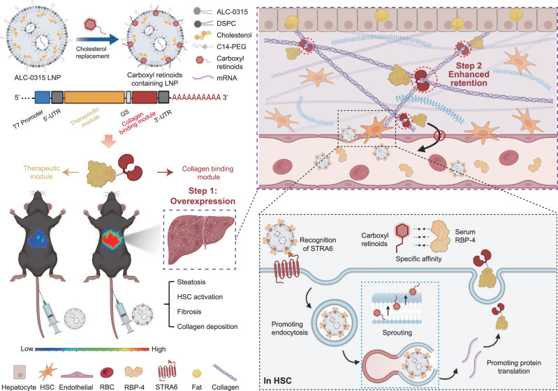Metabolic dysfunction-associated steatohepatitis (MASH) poses challenges for targeted delivery and retention of therapeutic proteins due to excess extracellular matrix (ECM). Here we present a new approach to treat MASH, termed "Fibrosis overexpression and retention (FORT)". In this strategy, we design (1) retinoid-derivative lipid nanoparticle (LNP) to enable enhanced mRNA overexpression in fibrotic regions, and (2) mRNA modifications which facilitate anchoring of therapeutic proteins in ECM. LNPs containing carboxyl-retinoids, rather than alcohol- or ester-retinoids, effectively deliver mRNA with over 10-fold enhancement of protein expression in fibrotic livers. The carboxyl-retinoid rearrangement on the LNP surface improves protein binding and membrane fusion. Therapeutic proteins are then engineered with an endogenous collagen-binding domain. These fusion proteins exhibit increased retention in fibrotic lesions and reduced systemic toxicity. In vivo, fibrosis-targeting LNPs encoding fusion proteins demonstrate superior therapeutic efficacy in three clinically relevant male-animal MASH models. This approach holds promise in fibrotic diseases unsuited for protein injection.