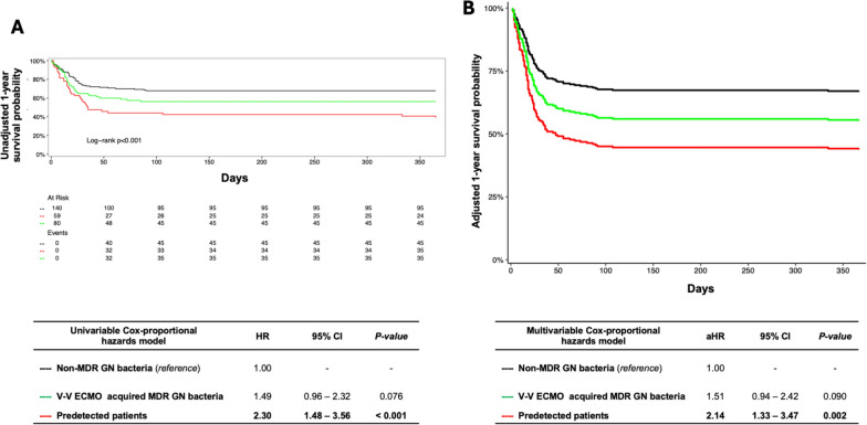 Results: Two hundred and seventy-nine V-V ECMO patients (72% male) were enrolled. The overall MDR GN bacteria percentage was 50%: 21% (n.59) detected before and 29% (n.80) after V-V ECMO placement. The overall 1-year mortality was 42%, with a higher risk observed in predetected patients (aHR 2.14 [1.33-3.47], p value 0.002), while not in 'V-V ECMO-acquired MDR GN bacteria' group (aHR 1.51 [0.94-2.42], p value 0.090), as compared to 'non-MDR GN bacteria' group (reference). Same findings were found considering only infections. A larger annual hospital V-V ECMO volume was associated with a lower probability of acquiring MDR GN bacteria during V-V ECMO course (aOR 0.91 [0.86-0.97], p value 0.002).