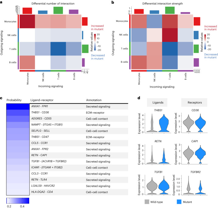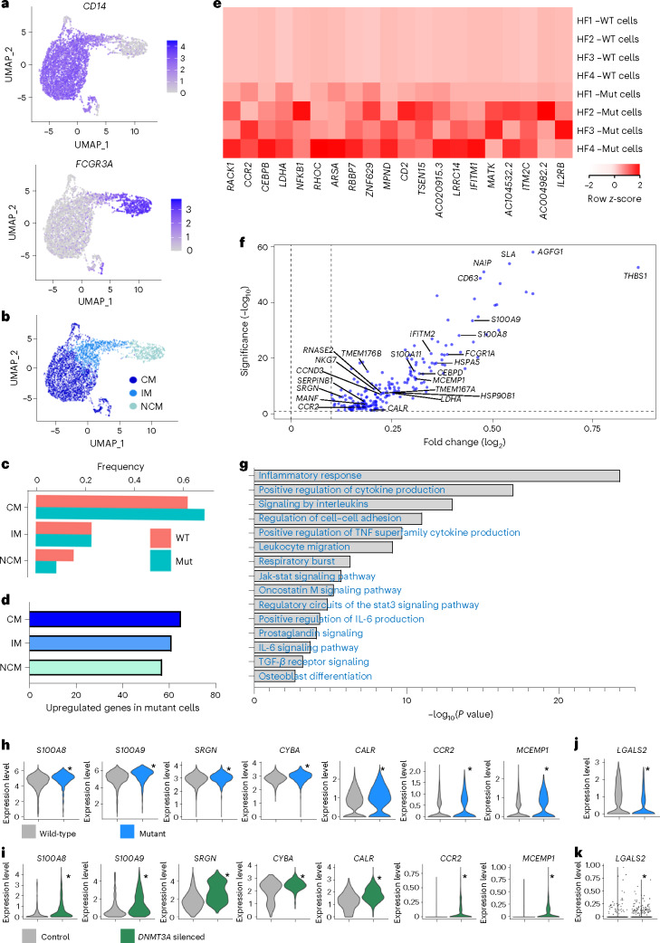 Clonal hematopoiesis of indeterminate potential (CHIP) is caused by somatic mutations in hematopoietic stem cells and associates with worse prognosis in patients with heart failure. Patients harboring CHIP mutations show enhanced inflammation. However, whether these signatures are derived from the relatively low number of cells harboring mutations or are indicators of systemic pro-inflammatory activation that is associated with CHIP is unclear. Here we assess the cell-intrinsic effects of CHIP mutant cells in patients with heart failure. Using an improved single-cell sequencing pipeline (MutDetect-Seq), we show that DNMT3A mutant monocytes, CD4+ T cells and NK cells exhibit altered gene expression profiles. While monocytes showed increased genes associated with inflammation and phagocytosis, T cells and NK cells present increased activation signatures and effector functions. Increased paracrine signaling pathways are predicted and validated between mutant and wild-type monocytes and T cells, which amplify inflammatory circuits. Altogether, these data provide novel insights into how CHIP might promote a worse prognosis in patients with heart failure.