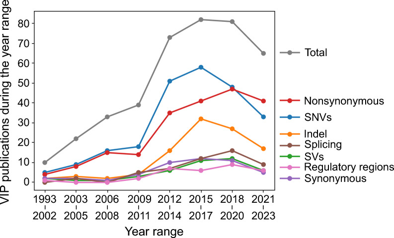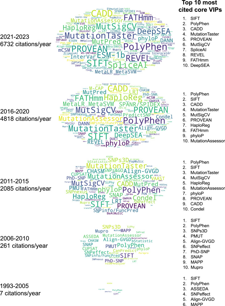 Results: The Variant Impact Predictor database (VIPdb) version 2 presents a collection of VIPs developed over the past three decades, summarizing their characteristics, ClinGen calibrated scores, CAGI assessment results, publication details, access information, and citation patterns. We previously summarized 217 VIPs and their features in VIPdb in 2019. Building upon this foundation, we identified and categorized an additional 190 VIPs, resulting in a total of 407 VIPs in VIPdb version 2. The majority of the VIPs have the capacity to predict the impacts of single nucleotide variants and nonsynonymous variants. More VIPs tailored to predict the impacts of insertions and deletions have been developed since the 2010s. In contrast, relatively few VIPs are dedicated to the prediction of splicing, structural, synonymous, and regulatory variants. The increasing rate of citations to VIPs reflects the ongoing growth in their use, and the evolving trends in citations reveal development in the field and individual methods.