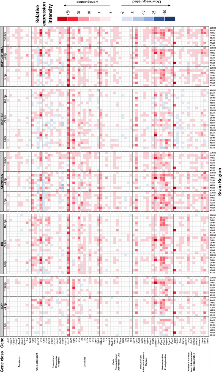 Methods: Building upon our prior findings, we aimed to understand the impact of systemic inflammation on neuroinflammatory gene transcripts in eight brain regions in rats exposed to (1) blast overpressure exposure [BOP], (2) cutaneous thermal injury [BU], (3) complex extremity injury, 3 hours (h) of tourniquet-induced ischemia, and hind limb amputation [CEI+tI+HLA], (4) BOP+BU or (5) BOP+CEI and delayed HLA [BOP+CEI+dHLA] at 6, 24, and 168 h post-injury (hpi).