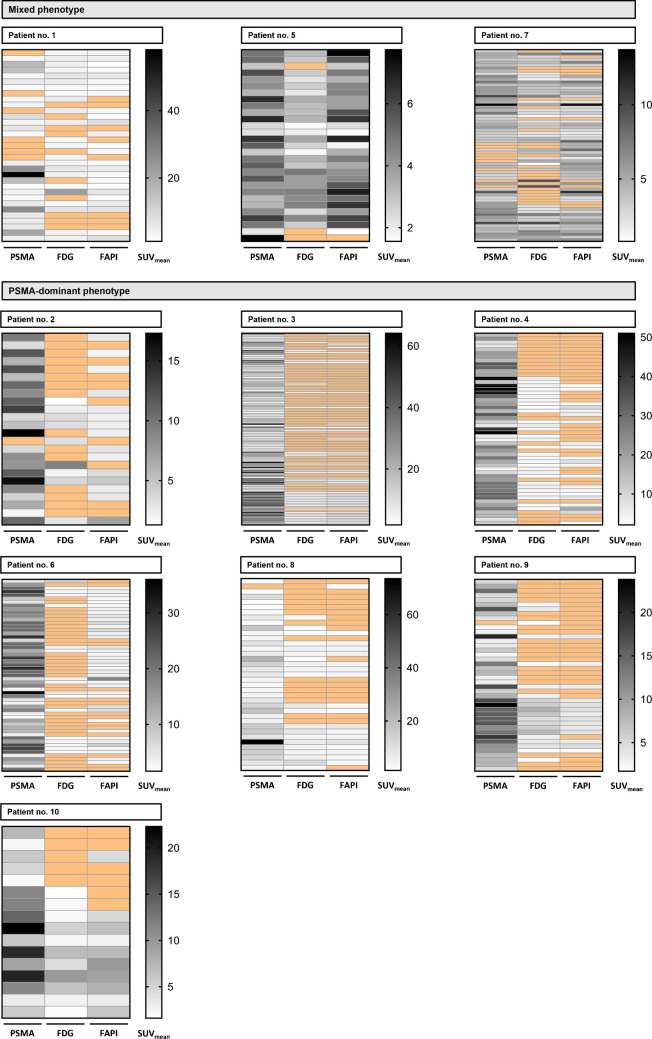 Results: In ten patients, 472 lesions were detected on all imaging modalities (miTNM regions: M1b: 327 (69.3%), M1a: 95 (20.1%), N1: 26 (5.5%), M1c: 18 (3.8%), T: 5 (1.1%) and Tr: 1 (0.2%). [68Ga]Ga-/[18F]F-PSMA-11/-1007 (n = 453 (96.0%)) demonstrates the highest detection rate, followed by [68Ga]Ga-FAPI-46 (n = 268 (56.8%))/2-[18F]FDG (n = 241 (51.1%)). Semiquantitative uptake was highest for [68Ga]Ga-/[18F]F-PSMA-11/-1007 (mean SUVmax (interquartile range): 22.7 (22.5), vs. [68Ga]Ga-FAPI-46 (7.7 (3.7)) and 2-[18F]FDG (6.8 (4.7)). Seven/three patients were retrospectively assigned to the PSMA-dominant/mixed phenotype. Median overall survival was significantly longer for patients who underwent [177Lu]Lu-PSMA-617 RLT and were retrospectively assigned to the PSMA-dominant phenotype (19.7 vs. 9.3 months).