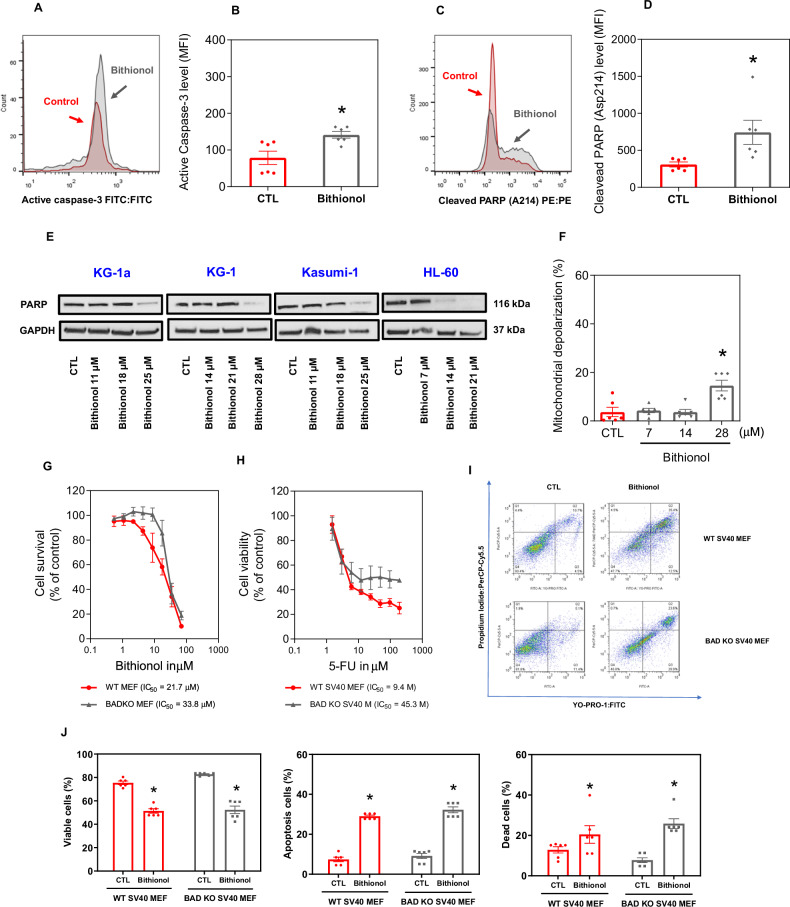 Acute myeloid leukaemia (AML) is a lethal bone marrow neoplasm caused by genetic alterations in blood cell progenitors. Leukaemic stem cells (LSCs) are responsible for the development of AML, drug resistance and relapse. Bithionol is an old anthelmintic drug with potential antibacterial, antiviral, antifungal, anti-Alzheimer, and antitumour properties. In this work, we focused on the anti-AML LSC properties of bithionol. This compound inhibited the viability of both solid and haematological cancer cells, suppressed AML stem-like cells, and inhibited AML growth in NSG mice at a dosage of 50 mg/kg, with tolerable systemic toxicity. Bithionol significantly reduced the levels of phospho-NF-κB p65 (Ser529) and phospho-NF-κB p65 (Ser536) and nuclear NF-κB p65 translocation in AML cells, indicating that this molecule can suppress NF-κB signalling. DNA fragmentation, nuclear condensation, cell shrinkage, phosphatidylserine externalisation, loss of transmembrane mitochondrial potential, caspase-3 activation and PARP-(Asp 214) cleavage were detected in bithionol-treated AML cells, indicating the induction of apoptosis. Furthermore, this compound increased mitochondrial superoxide levels, and bithionol-induced cell death was partially prevented by cotreatment with the selective ferroptosis inhibitor ferrostatin-1, indicating the induction of ferroptosis. In addition, bithionol synergised with venetoclax in AML cells, indicating the translational potential of bithionol to enhance the effects of venetoclax in patients with AML. Taken together, these data indicate that bithionol is a potential new anti-AML drug.