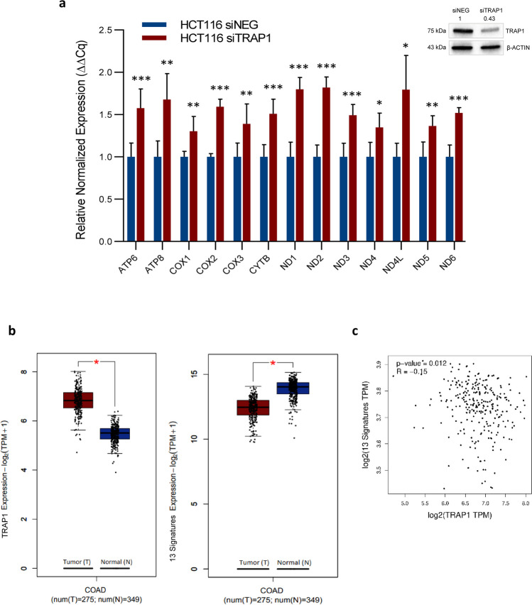 Metabolic rewiring promotes cancer cell adaptation to a hostile microenvironment, representing a hallmark of cancer. This process involves mitochondrial function and is mechanistically linked to the balance between mitochondrial biogenesis (MB) and mitophagy. The molecular chaperone TRAP1 is overexpressed in 60-70% of human colorectal cancers (CRC) and its over-expression correlates with poor clinical outcome, being associated with many cancer cell functions (i.e. adaptation to stress, protection from apoptosis and drug resistance, protein synthesis quality control, metabolic rewiring from glycolysis to mitochondrial respiration and vice versa). Here, the potential new role of TRAP1 in regulating mitochondrial dynamics was investigated in CRC cell lines and human CRCs. Our results revealed an inverse correlation between TRAP1 and mitochondrial-encoded respiratory chain proteins both at transcriptional and translational levels. Furthermore, TRAP1 silencing is associated with increased mitochondrial mass and mitochondrial DNA copy number (mtDNA-CN) as well as enhanced MB through PGC-1α/TFAM signalling pathway, promoting the formation of new functioning mitochondria and, likely, underlying the metabolic shift towards oxidative phosphorylation. These results suggest an involvement of TRAP1 in regulating MB process in human CRC cells. KEY MESSAGES: TRAP1 inversely correlates with protein-coding mitochondrial gene expression in CRC cells and tumours. TRAP1 silencing correlates with increased mitochondrial mass and mtDNA copy number in CRC cells. TRAP1 silencing favours mitochondrial biogenesis in CRC cells.