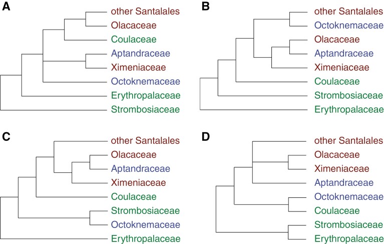 Background and aims: Biological aspects of haustorial parasitism have significant effects on the configuration of the plastid genome. Approximately half the diversity of haustorial parasites belongs to the order Santalales, where a clearer picture of plastome evolution in relation to parasitism is starting to emerge. However, in previous studies of plastome evolution there is still a notable under-representation of members from non-parasitic and deep-branching hemiparasitic lineages, limiting evolutionary inference around the time of transition to a parasitic lifestyle. To expand taxon sampling relevant to this transition we therefore targeted three families of non-parasites (Erythropalaceae, Strombosiaceae and Coulaceae), two families of root-feeding hemiparasites (Ximeniaceae and Olacaceae) and two families of uncertain parasitic status (Aptandraceae and Octoknemaceae). With data from these lineages we aimed to explore plastome evolution in relation to the evolution of parasitism.