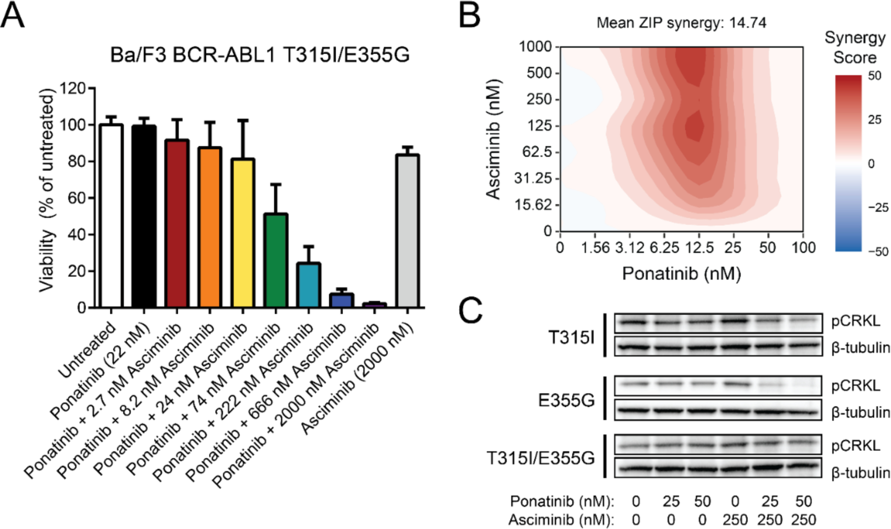 BCR-ABL1 compound mutations can lead to resistance to ABL1 inhibitors in chronic myeloid leukemia (CML), which could be targeted by combining the ATP-site inhibitor ponatinib and the allosteric inhibitor asciminib. Here, we report the clinical validation of this approach in a CML patient, providing a basis for combination therapy to overcome such resistance.