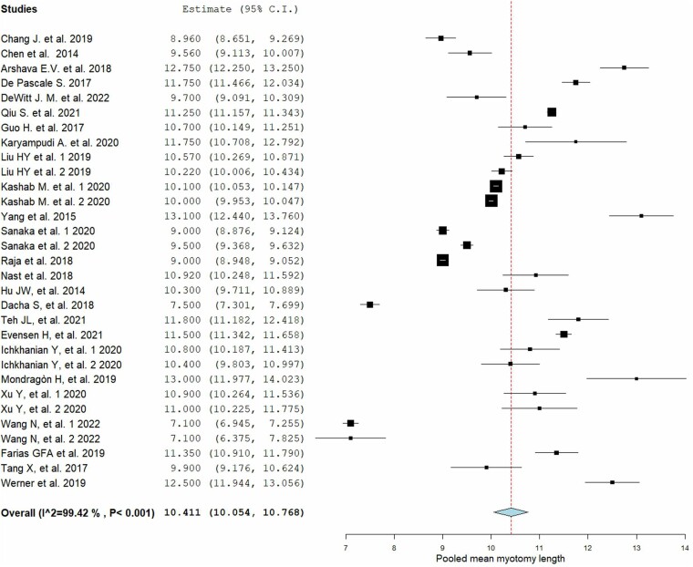 Peroral endoscopic myotomy (POEM) is an established treatment for achalasia, yet there is still a lack of technical standardization. No clear definition of 'long', 'standard', or 'short' POEM exists to date. We conducted a systematic review with meta-analysis to analyze current POEM length standards. We included studies reporting technical details of POEM, in which no definite or comparative myotomy length was intentionally adopted (standard myotomy). The primary outcome was the pooled mean total myotomy length. Sub-group analyses were performed to explore heterogeneity across studies. From the initial 7172 records, 31 studies with 3023 patients were included. Pooled mean of total myotomy length was 10.39 cm (95% CI 10.06-10.71; I2 99.3%). Pooled mean of esophageal and gastric myotomy length, provided by 17 studies, was 7.11 cm (95% CI 6.51-7.71; I2 99.8%) and 2.81 cm (95% CI 2.41-3-22; I2 99.8%), respectively. On subgroup analysis for achalasia subtypes, pooled mean length in non-spastic achalasia (type I and II) was 10.17 cm (95% CI 9.91-10.43; I2 94.2%), while in type III it was 14.02 cm (95% CI 10.59-17.44; I2 98.9%). Pooled mean myotomy length for studies conducted between 2014-2020 was 10.53 cm (95% CI, 10.22-10.84; I2 99.1%) and 9.74 cm (95% CI, 7.95-11.54; I2 99.7%) in 2021-2022. Myotomy length during a 'standard' POEM is 10.4 cm, remaining over 10 cm in non-spastic achalasia. The high heterogeneity across studies confirms that the POEM technique needs further standardization. We found no significant time trend towards adopting short POEM, despite recent evidence supporting its use.