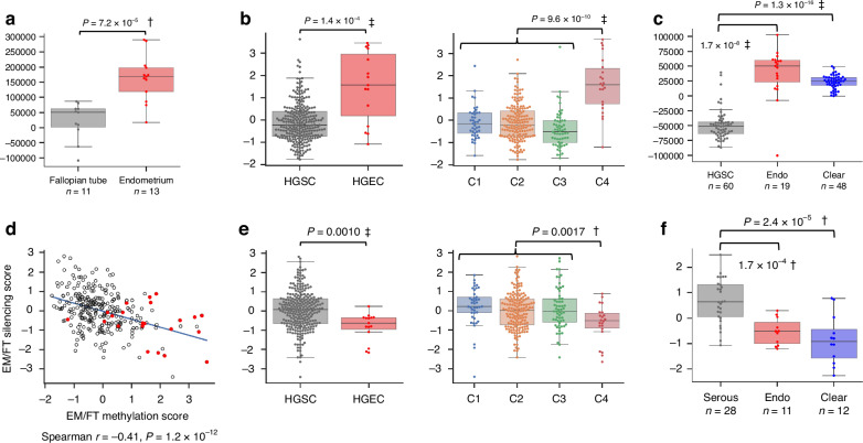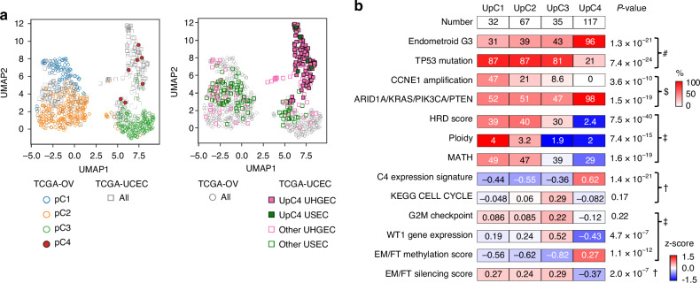 Methods: Fresh-frozen samples from 15 ovarian HGECs and 274 ovarian HGSCs in the JGOG-TR2 cohort were submitted to targeted DNA sequencing, RNA sequencing, DNA methylation array, and SNP array. We additionally analyzed 555 ovarian HGSCs from TCGA-OV and 287 endometrial high-grade carcinomas from TCGA-UCEC.