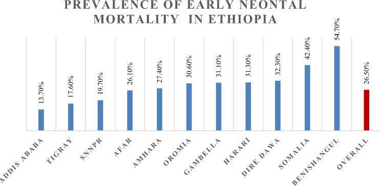 Results: The prevalence of early neonatal mortality in Ethiopia was 26.5 (95% Cl; 22.5-31.08) per 1000 live births. Maternal age 20-35 (AOR, 0.38; 95% Cl, 0.38-0.69), richer wealth index (AOR, 0.47; 95% Cl, 0.23-0.96), having no antenatal care visit (AOR, 1.86; 95% Cl, 1.05-3.30), first birth order (AOR, 3.41; 95% Cl, 1.54-7.56), multiple pregnancy (AOR, 18.5; 95% Cl 8.8-38.9), presence of less than two number of under-five children (AOR, 5.83; 95% Cl, 1.71-19.79) and Somali region (AOR, 3.49; 95% Cl, 1.70-12.52) were significantly associated with early neonatal mortality.