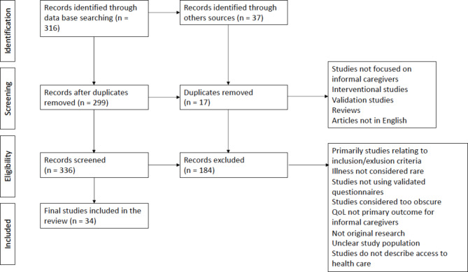 Results: We initially identified 299 references and then included thirty-four articles. The included articles address three main topics, namely caregiver quality of life, health care accessibility, and the impact of health care accessibility on caregiver QOL.
