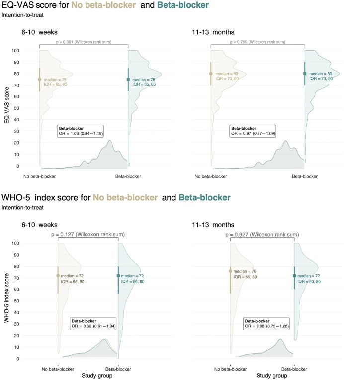 Methods and results: From this parallel-group, open-label, registry-based randomized clinical trial, EQ-5D, and World Health Organization well-being index-5 (WHO-5) questionnaires were obtained at 6-10 weeks and 11-13 months after AMI in 4080 and 806 patients, respectively. We report results from intention-to-treat and on-treatment analyses for the overall population and relevant subgroups using Wilcoxon rank sum test and adjusted ordinal regression analyses. Of the 4080 individuals reporting EQ-5D (median age 64 years, 22% female), 2023 were randomized to beta-blockers. The main outcome, median EQ-5D index score, was 0.94 [interquartile range (IQR) 0.88, 0.97] in the beta-blocker group, and 0.94 (IQR 0.88, 0.97) in the no-beta-blocker group 6-10 weeks after AMI, OR 1.00 [95% CI 0.89-1.13; P > 0.9]. After 11-13 months, results remained unchanged. Findings were robust in on-treatment analyses and across relevant subgroups. Secondary outcomes, EQ-VAS and WHO-5 index score, confirmed these results.