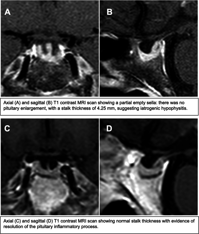 Methods: We report the case of a 41-year-old woman with a medical history of left adrenalectomy for cortisol producing adenoma (2005) with no sign of adrenal insufficiency at follow-up, right mastectomy for BRCA1/2 negative carcinoma (2013) and left parotid BRAF-V600E wild-type melanoma (2019), treated with nivolumab adjuvant therapy. In August 2019, following the fifth nivolumab administration, the patient developed central hypocortisolism due to iatrogenic hypophysitis, confirmed by brain MRI and properly treated with oral hydrocortisone. Nivolumab was discontinued due to the patient's decision. In October 2020 and April 2021, the patient had ischaemic strokes, requiring systemic thrombolysis. Echocardiographic examination then revealed a left atrial mass, with histological finding of myxoma.