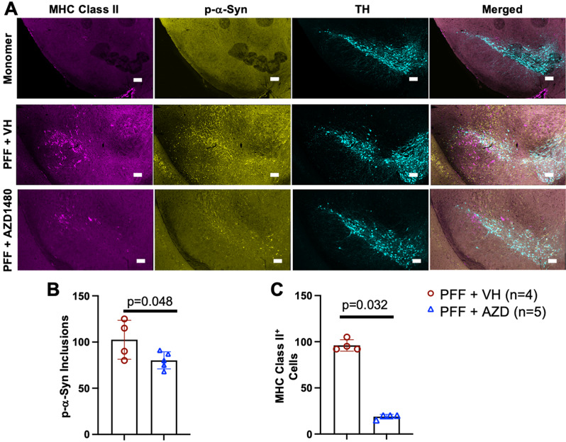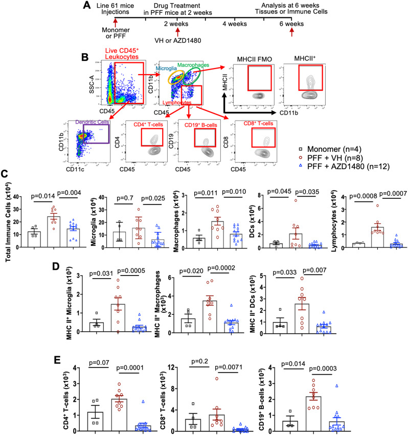 Parkinson's disease (PD) is characterized by neuroinflammation, progressive loss of dopaminergic neurons, and accumulation of α-synuclein (α-Syn) into insoluble aggregates called Lewy pathology. The Line 61 α-Syn mouse is an established preclinical model of PD; Thy-1 is used to promote human α-Syn expression, and features of sporadic PD develop at 9-18 months of age. To accelerate the PD phenotypes, we injected sonicated human α-Syn preformed fibrils (PFFs) into the striatum, which produced phospho-Syn (p-α-Syn) inclusions in the substantia nigra pars compacta and significantly increased MHC Class II-positive immune cells. Additionally, there was enhanced infiltration and activation of innate and adaptive immune cells in the midbrain. We then used this new model, Line 61-PFF, to investigate the effect of inhibiting the JAK/STAT signaling pathway, which is critical for regulation of innate and adaptive immune responses. After administration of the JAK1/2 inhibitor AZD1480, immunofluorescence staining showed a significant decrease in p-α-Syn inclusions and MHC Class II expression. Flow cytometry showed reduced infiltration of CD4+ T-cells, CD8+ T-cells, CD19+ B-cells, dendritic cells, macrophages, and endogenous microglia into the midbrain. Importantly, single-cell RNA-Sequencing analysis of CD45+ cells from the midbrain identified 9 microglia clusters, 5 monocyte/macrophage (MM) clusters, and 5 T-cell (T) clusters, in which potentially pathogenic MM4 and T3 clusters were associated with neuroinflammatory responses in Line 61-PFF mice. AZD1480 treatment reduced cell numbers and cluster-specific expression of the antigen-presentation genes H2-Eb1, H2-Aa, H2-Ab1, and Cd74 in the MM4 cluster and proinflammatory genes such as Tnf, Il1b, C1qa, and C1qc in the T3 cluster. Together, these results indicate that inhibiting the JAK/STAT pathway suppresses the activation and infiltration of innate and adaptive cells, reducing neuroinflammation in the Line 61-PFF mouse model.