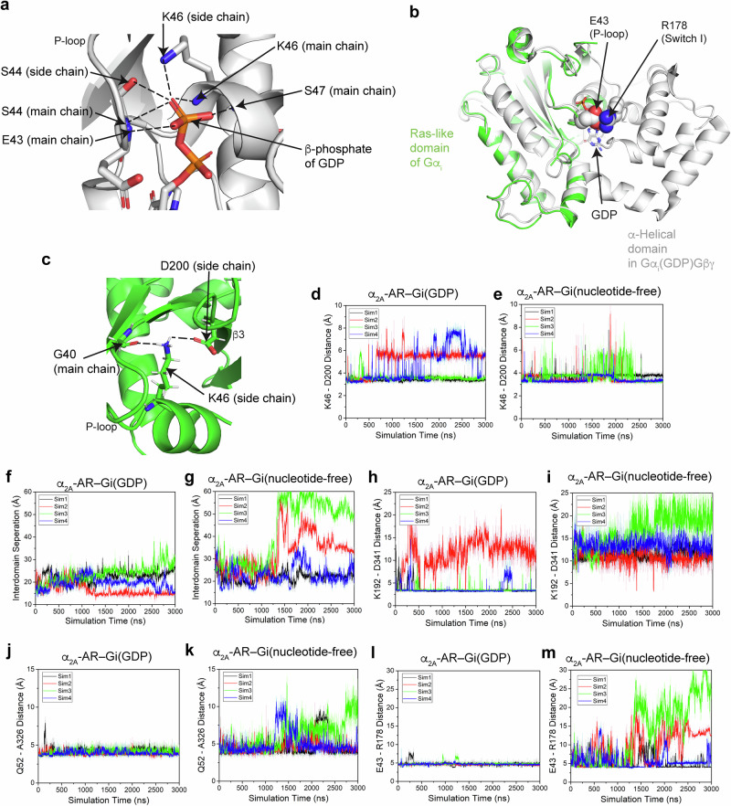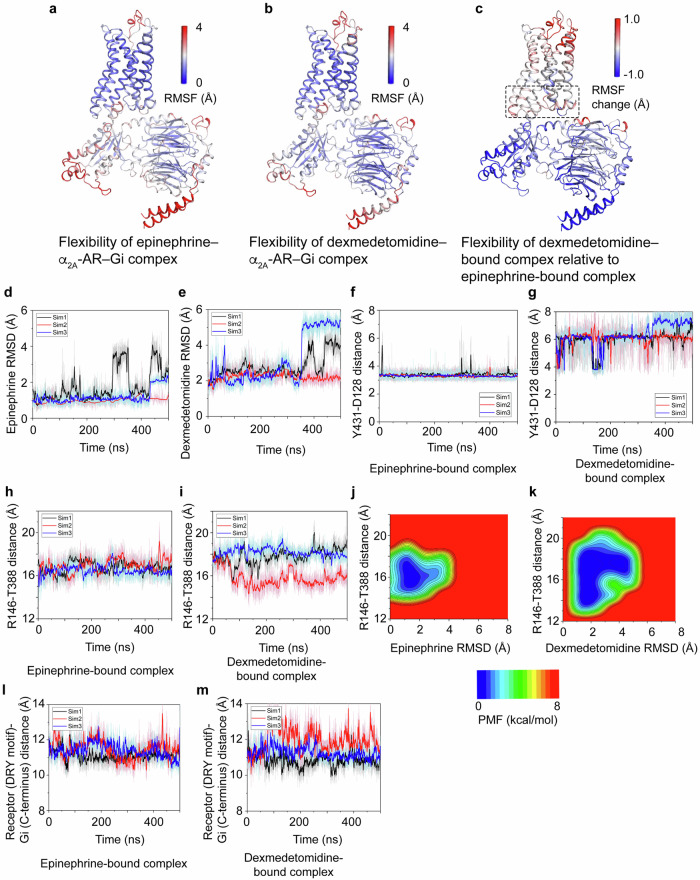 Agonists targeting α2-adrenergic receptors (ARs) are used to treat diverse conditions, including hypertension, attention-deficit/hyperactivity disorder, pain, panic disorders, opioid and alcohol withdrawal symptoms, and cigarette cravings. These receptors transduce signals through heterotrimeric Gi proteins. Here, we elucidated cryo-EM structures that depict α2A-AR in complex with Gi proteins, along with the endogenous agonist epinephrine or the synthetic agonist dexmedetomidine. Molecular dynamics simulations and functional studies reinforce the results of the structural revelations. Our investigation revealed that epinephrine exhibits different conformations when engaging with α-ARs and β-ARs. Furthermore, α2A-AR and β1-AR (primarily coupled to Gs, with secondary associations to Gi) were compared and found to exhibit different interactions with Gi proteins. Notably, the stability of the epinephrine-α2A-AR-Gi complex is greater than that of the dexmedetomidine-α2A-AR-Gi complex. These findings substantiate and improve our knowledge on the intricate signaling mechanisms orchestrated by ARs and concurrently shed light on the regulation of α-ARs and β-ARs by epinephrine.
