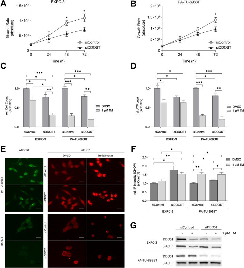 The dolichyl-diphosphooligosaccharide-protein glycosyltransferase non-catalytic subunit (DDOST) is a key component of the oligosaccharyltransferase complex catalyzing N-linked glycosylation in the endoplasmic reticulum lumen. DDOST is associated with several cancers and congenital disorders of glycosylation. However, its role in pancreatic cancer remains elusive, despite its enriched pancreatic expression. Using quantitative mass spectrometry, we identify 30 differentially expressed proteins and phosphopeptides (DEPs) after DDOST knockdown in the pancreatic ductal adenocarcinoma (PDAC) cell line PA-TU-8988T. We evaluated DDOST / DEP protein-protein interaction networks using STRING database, correlation of mRNA levels in pancreatic cancer TCGA data, and biological processes annotated to DEPs in Gene Ontology database. The inferred DDOST regulated phenotypes were experimentally verified in two PDAC cell lines, PA-TU-8988T and BXPC-3. We found decreased proliferation and cell viability after DDOST knockdown, whereas ER-stress, ROS-formation and apoptosis were increased. In conclusion, our results support an oncogenic role of DDOST in PDAC by intercepting cell stress events and thereby reducing apoptosis. As such, DDOST might be a potential biomarker and therapeutic target for PDAC.