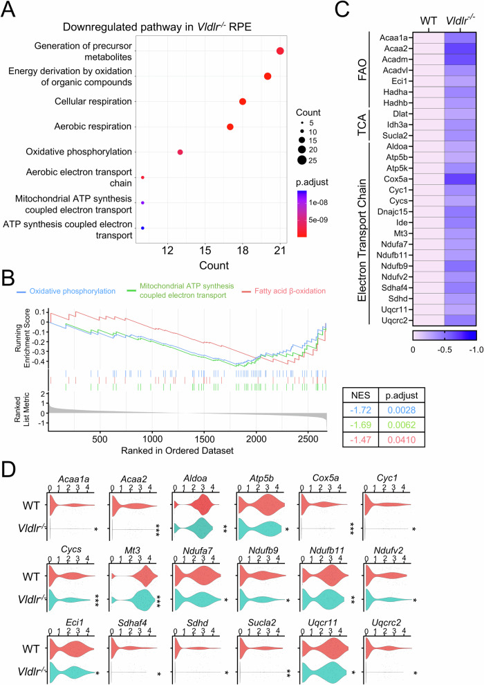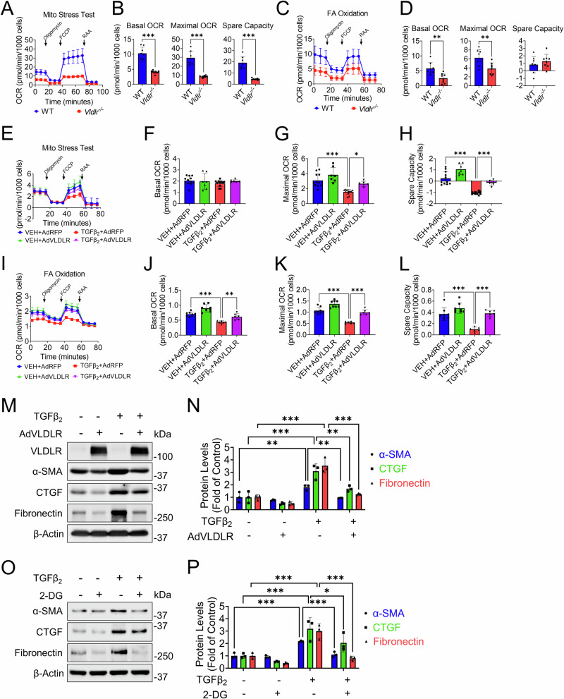 Subretinal fibrosis permanently impairs the vision of patients with neovascular age-related macular degeneration. Despite emerging evidence revealing the association between disturbed metabolism in retinal pigment epithelium (RPE) and subretinal fibrosis, the underlying mechanism remains unclear. In the present study, single-cell RNA sequencing revealed, prior to subretinal fibrosis, genes in mitochondrial fatty acid oxidation are downregulated in the RPE lacking very low-density lipoprotein receptor (VLDLR), especially the rate-limiting enzyme carnitine palmitoyltransferase 1A (CPT1A). We found that overexpression of CPT1A in the RPE of Vldlr-/- mice suppresses epithelial-to-mesenchymal transition and fibrosis. Mechanistically, TGFβ2 induces fibrosis by activating a Warburg-like effect, i.e. increased glycolysis and decreased mitochondrial respiration through ERK-dependent CPT1A degradation. Moreover, VLDLR blocks the formation of the TGFβ receptor I/II complex by interacting with unglycosylated TGFβ receptor II. In conclusion, VLDLR suppresses fibrosis by attenuating TGFβ2-induced metabolic reprogramming, and CPT1A is a potential target for treating subretinal fibrosis.