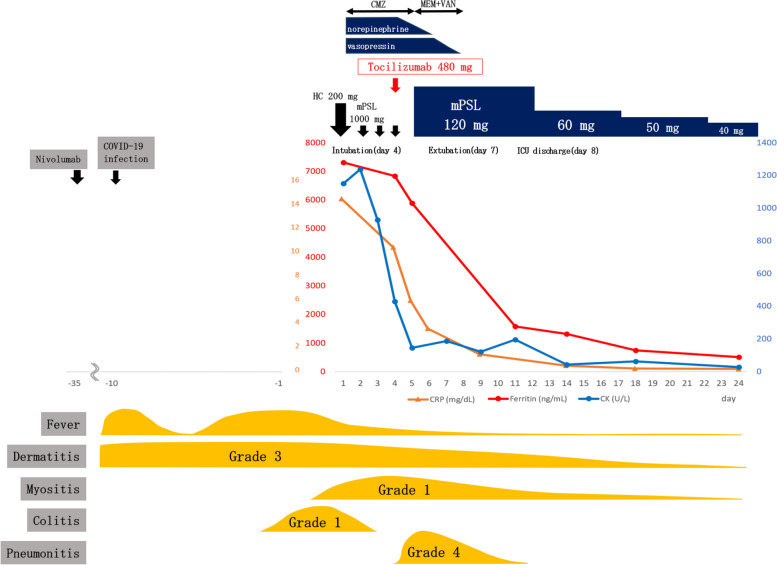 Conclusion: In patients previously treated with immune checkpoint inhibitors, irAE-CRS should be considered as a differential diagnosis when multiple organ damage is observed in addition to inflammatory findings. It is recommended to start treatment with steroids; if the disease is refractory, other immunosuppressive therapies such as tocilizumab should be introduced as early as possible.