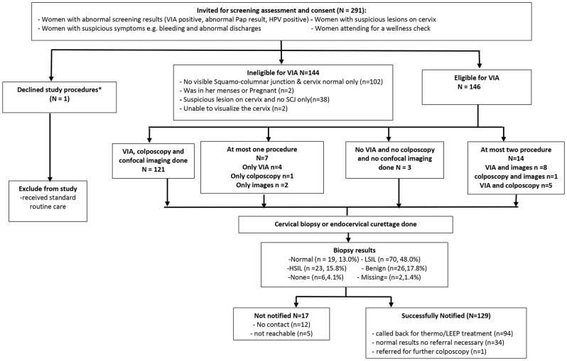 Results: Between November 2021 and July 2022, we screened 291 women with a median age of 36 years and 65.7% were HIV positive. Of the women screened, 146 were eligible for VIA, 123 were screened with the SCME, and we obtained confocal images from 103 women. Of those screened with the SCME, 60% found it comfortable and 81% were willing to screen again with it. Confocal images from 79% of the women showed distinguishable cellular features, while images from the remaining 21% were challenging to analyze. Nurses reported a mean score of 85% regarding the SCME's usefulness to their work, 71% regarding their satisfaction and willingness to use it again, 63% in terms of ease of use, and 57% concerning the ease of learning how to operate the SCME.