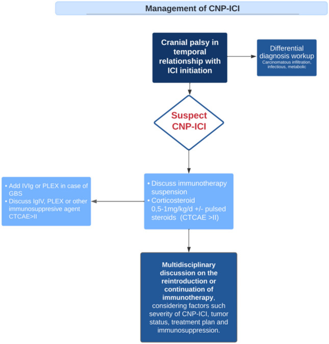 Results: Out of the 1205 articles screened, 68 articles were included after fulfilling the inclusion criteria, for a total of 136 patients. All articles were case reports and case series. In the cohort studied, 52% of patients were treated with anti PD-1/PDL-1 therapies, 14% with anti CTLA-4 therapies, and 34% with a combination of anti CTLA-4 and anti PD-1/PDL-1 therapies. The facial nerve was the most affected cranial nerve, involved in 38% of cases, followed by the optic nerve (35%), the cochleovestibular nerve (12%), and the abducens nerve (10%). The median time from the initial immune checkpoint inhibitor (ICI) injection to the onset CNP-ICI was 10 weeks (IQR 4-20). Magnetic resonance imaging demonstrated contrast enhancement or abnormal signal of the affected nerve in 43% of cases. Cerebrospinal fluid analysis indicated lymphocytic pleocytosis in 59% of cases. At the onset of immune-related adverse events, 89% of patients discontinued immunotherapy, and 92% received treatment for CNP-ICI. Treatment regimens included corticosteroids in 86% of cases, intravenous immunoglobulin in 21%, and plasma exchange in 5.1%. Among the whole population, 33% achieved recovery, 52% showed clinical improvement, 16% remained stable, and 3% experienced worsening of their condition. Rechallenge with immunotherapy was significantly associated with the emergence of new immune-related Adverse Events (irAEs).