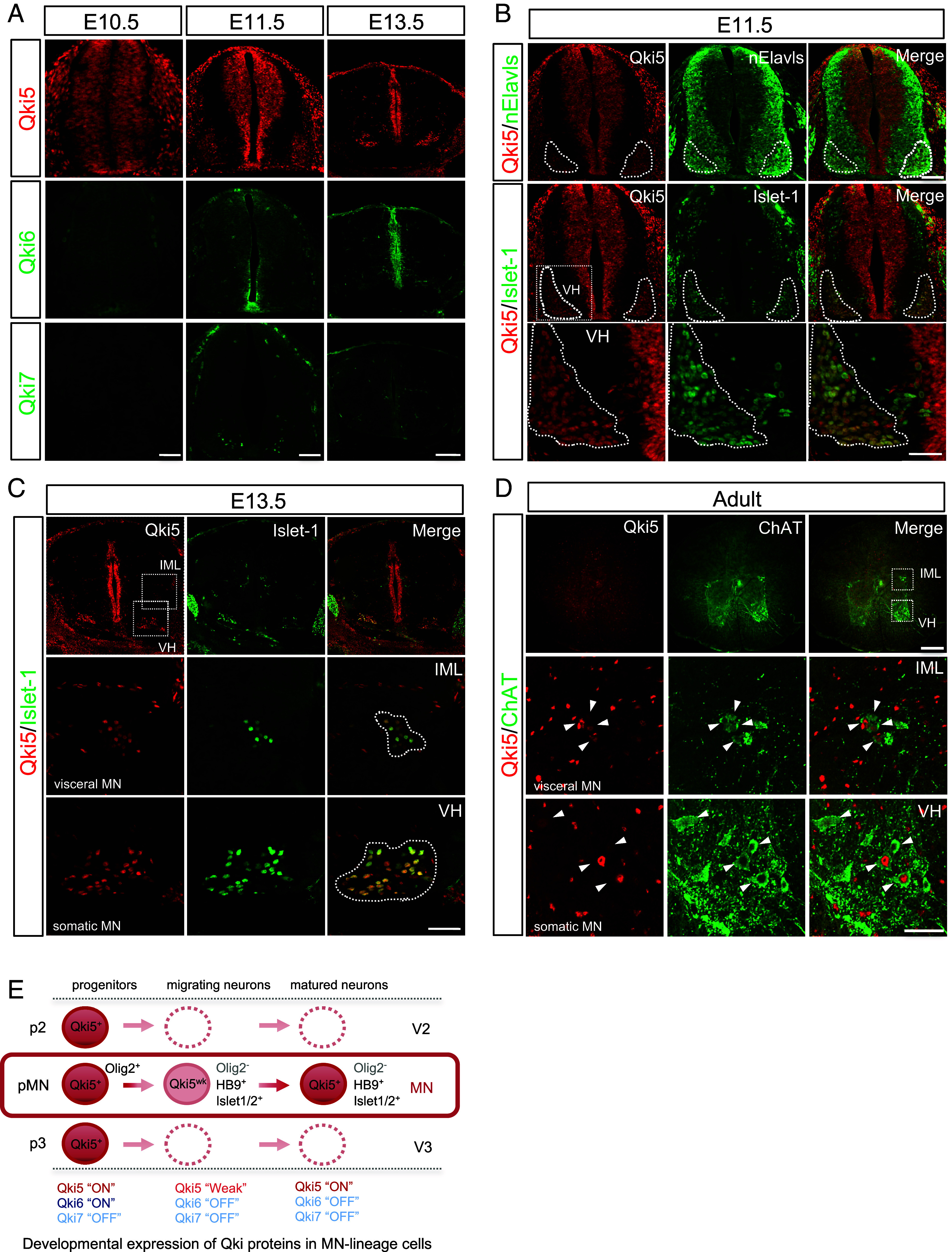 Many RNA-binding proteins (RBPs) are linked to the dysregulation of RNA metabolism in motor neuron diseases (MNDs). However, the molecular mechanisms underlying MN vulnerability have yet to be elucidated. Here, we found that such an RBP, Quaking5 (Qki5), contributes to formation of the MN-specific transcriptome profile, termed "MN-ness," through the posttranscriptional network and maintenance of the mature MNs. Immunohistochemical analysis and single-cell RNA sequencing (scRNA-seq) revealed that Qki5 is predominantly expressed in MNs, but not in other neuronal populations of the spinal cord. Furthermore, comprehensive RNA sequencing (RNA-seq) analyses revealed that Qki5-dependent RNA regulation plays a pivotal role in generating the MN-specific transcriptome through pre-messenger ribonucleic acid (mRNA) splicing for the synapse-related molecules and c-Jun N-terminal kinase/stress-activated protein kinase (JNK/SAPK) signaling pathways. Indeed, MN-specific ablation of the Qki5 caused neurodegeneration in postnatal mice and loss of Qki5 function resulted in the aberrant activation of stress-responsive JNK/SAPK pathway both in vitro and in vivo. These data suggested that Qki5 plays a crucial biological role in RNA regulation and safeguarding of MNs and might be associated with pathogenesis of MNDs.