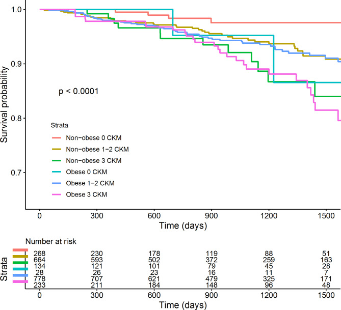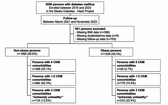 Methods: We analysed persons who were enrolled in the prospective Silesia Diabetes Heart Project (NCT05626413). Individuals were divided into 6 categories according to the presence of different clinical risk factors (obesity and CKM comorbidities): (i) Group 1: non-obese with 0 CKM comorbidities; (ii) Group 2: non-obese with 1-2 CKM comorbidities; (iii) Group 3: non-obese with 3 CKM comorbidities (non-obese "extremely unhealthy"); (iv) Group 4: obese with 0 CKM comorbidities; (v) Group 5: obese with 1-2 CKM comorbidities; and (vi) Group 6: obese with 3 CKM comorbidities (obese "extremely unhealthy"). The primary outcome was a composite of CV death, myocardial infarction (MI), new onset of heart failure (HF), and ischemic stroke.