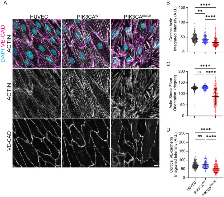 Somatic activating mutations in PIK3CA are common drivers of vascular and lymphatic malformations. Despite common biophysical signatures of tissues susceptible to lesion formation, including compliant extracellular matrix and low rates of perfusion, lesions vary in clinical presentation from localized cystic dilatation to diffuse and infiltrative vascular dysplasia. The mechanisms driving the differences in disease severity and variability in clinical presentation and the role of the biophysical microenvironment in potentiating progression are poorly understood. Here, we investigate the role of hemodynamic forces and the biophysical microenvironment in the pathophysiology of vascular malformations, and we identify hemodynamic shear stress and defective endothelial cell mechanotransduction as key regulators of lesion progression. We found that constitutive PI3K activation impaired flow-mediated endothelial cell alignment and barrier function. We show that defective shear stress sensing in PIK3CA E542K endothelial cells is associated with reduced myosin light chain phosphorylation, junctional instability, and defective recruitment of vinculin to cell-cell junctions. Using 3D microfluidic models of the vasculature, we demonstrate that PIK3CA E542K microvessels apply reduced traction forces and are unaffected by flow interruption. We further found that draining transmural flow resulted in increased sprouting and invasion responses in PIK3CA E542K microvessels. Mechanistically, constitutive PI3K activation decreased cellular and nuclear elasticity resulting in defective cellular tensional homeostasis in endothelial cells which may underlie vascular dilation, tissue hyperplasia, and hypersprouting in PIK3CA-driven venous and lymphatic malformations. Together, these results suggest that defective nuclear mechanics, impaired cellular mechanotransduction, and maladaptive hemodynamic responses contribute to the development and progression of PIK3CA-driven vascular malformations.