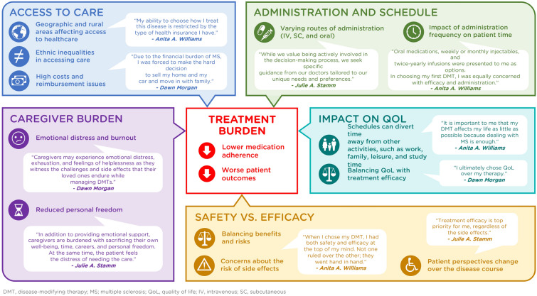 The number of disease-modifying therapies (DMTs) approved for the treatment of multiple sclerosis (MS) has greatly increased in recent decades, leading to higher treatment complexity. DMTs can differ in mode and frequency of administration, benefit-risk profile, and associated costs. Patients with MS contend not only with the burden of their chronic disease but also with the treatment burden of their MS therapy. Adhering to dosing schedules and infusion appointments can be difficult for busy, working-age patients or those with limited access to transportation. Patients and healthcare professionals (HCPs) may have differing priorities, concerns, and preferences when selecting treatment, potentially affecting treatment satisfaction and, importantly, adherence. Additionally, patients face direct and indirect costs related to treatment. These factors can all contribute to a high treatment burden on patients, impacting their quality of life and potentially leading to worse patient outcomes. HCPs, patients, and caregivers must work together to alleviate treatment burden through effective communication, shared decision-making, appreciating each other's perspectives, and additional HCP support. Consideration of treatment burden into clinical guidelines is also warranted. In this review, we examine key factors impacting treatment burden for patients with MS, with a focus on the patient perspective as provided by our patient authors, and provide strategies to minimize treatment burden.