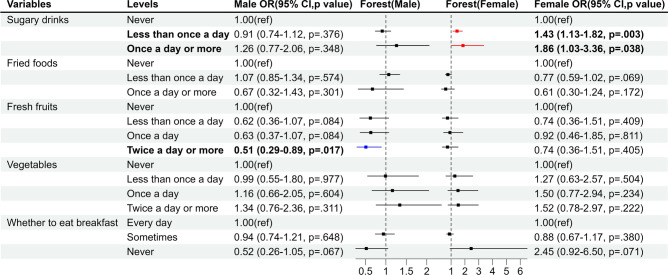 Currently, the global prevalence of myopia is high and on the rise, seriously affecting the health of students. Studies have suggested that dietary factors may be associated with the occurrence and development of myopia, but the results are inconsistent. This survey aims to analyze the correlation between dietary factors and myopia while controlling for more confounding factors. A multi-stage stratified cluster sampling method was performed to select 10,619 primary and secondary school students in Shenyang for visual examination, and questionnaires were administered to 6974 of them. Logistic regression was performed with myopia as the dependent variable and the variables with p < 0.1 in the univariate analysis as independent variables. Sensitivity analysis was conducted using propensity score matching. The results showed that the overall prevalence of myopia among primary and secondary school students in Shenyang was 59.1%, with mild myopia predominating. Students who ate fresh fruits two or more times a day had a 0.69 times lower risk of myopia compared to those who did not eat fruits (95% CI 0.50-0.97). However, subgroup analysis demonstrated that this protective effect was only significant for male students, with an OR of 0.59 (95% CI 0.38-0.91). Moreover, female students who consumed sugary beverages once or more a day had a 1.8 times higher risk of myopia compared to those who did not consume sugary beverages (95% CI 1.03-3.15). Vegetable consumption, intake of fried foods, and breakfast habits were not significantly associated with myopia. In summary, excessive consumption of sugary beverages could increase the risk of myopia, especially in female students, whereas fruit intake contributed to reducing the risk of myopia, particularly in male students.