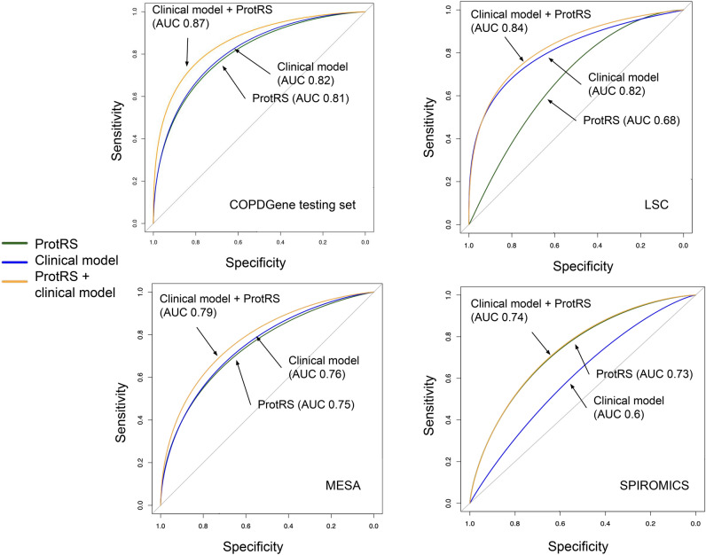 Protein biomarkers are associated with mortality in cardiovascular disease, but their effect on predicting respiratory and all-cause mortality is not clear. We tested whether a protein risk score (protRS) can improve prediction of all-cause mortality over clinical risk factors in smokers. We utilized smoking-enriched (COPDGene, LSC, SPIROMICS) and general population-based (MESA) cohorts with SomaScan proteomic and mortality data. We split COPDGene into training and testing sets (50:50) and developed a protRS based on respiratory mortality effect size and parsimony. We tested multivariable associations of the protRS with all-cause, respiratory, and cardiovascular mortality, and performed meta-analysis, area-under-the-curve (AUC), and network analyses. We included 2232 participants. In COPDGene, a penalized regression-based protRS was most highly associated with respiratory mortality (OR 9.2) and parsimonious (15 proteins). This protRS was associated with all-cause mortality (random effects HR 1.79 [95% CI 1.31-2.43]). Adding the protRS to clinical covariates improved all-cause mortality prediction in COPDGene (AUC 0.87 vs 0.82) and SPIROMICS (0.74 vs 0.6), but not in LSC and MESA. Protein-protein interaction network analyses implicate cytokine signaling, innate immune responses, and extracellular matrix turnover. A blood-based protein risk score predicts all-cause and respiratory mortality, identifies potential drivers of mortality, and demonstrates heterogeneity in effects amongst cohorts.