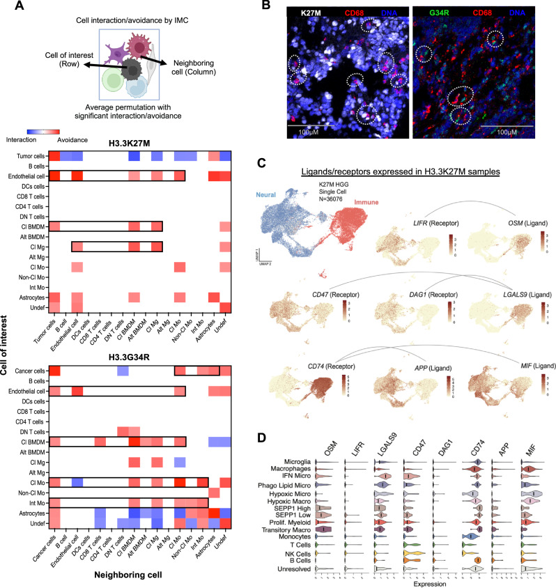 A Heat map indicates IMC spatial analysis among cell phenotypes and their patterns of cell-cell interactions (red) or avoidance (blue) for H3.3K27M (top) and H3.3G34R (bottom) tumors, determined by pairwise scores. Only interaction/avoidance >50% (random chance) are shown. Associations should be read row-to-column. Rows represent the relationship of a cell type of interest. Columns represent the relationship of other surrounding cell types. Panel illustrating cell interactions created with BioRender.com, released under a Creative Commons Attribution-NonCommercial-NoDerivs 4.0 International license. B Representative multichannel IMC images of myeloid cells (CD68+ ) interacting with K27M and G34R cells. C UMAP plots colored by expression of ligand or receptor pairs in H3.3K27M tumors (N = 4). Both immune and non-immune cells were used to predict ligand-receptor interactions. D Expression of ligand-receptor pairs in H3.3K27M immune cell populations.