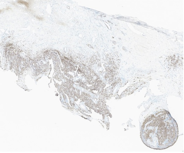 Immunohistopathology of the Right Atrial Mass Immunohistopathology of the right atrial mass at 40× magnification showing tumor cells diffusely positive for muscle markers desmin.