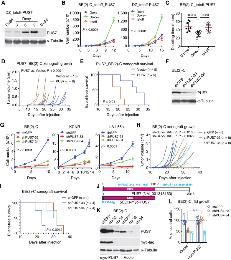 Pseudouridylation is a common RNA modification that is catalyzed by the family of pseudouridine synthases (PUS). Pseudouridylation can increase RNA stability and rigidity, thereby impacting RNA splicing, processing, and translation. Given that RNA metabolism is frequently altered in cancer, pseudouridylation may be a functionally important process in tumor biology. Here, we show that the MYC family of oncoproteins transcriptionally upregulates PUS7 expression during cancer development. PUS7 is essential for the growth and survival of MYC-driven cancer cells and xenografts by promoting adaptive stress responses and amino acid biosynthesis and import. ATF4, a master regulator of stress responses and cellular metabolism, was identified as a key downstream mediator of PUS7 functional activity. Induction of ATF4 by MYC oncoproteins and cellular stress required PUS7, and ATF4 overexpression overcame the growth inhibition caused by PUS7 deficiency. Mechanistically, PUS7 induced pseudouridylation of MCTS1 mRNA, which enhanced its translation. MCTS1, a noncanonical translation initiation factor, drove stress-induced ATF4 protein expression. A PUS7 consensus pseudouridylation site in the 3' untranslated region of ATF4 mRNA was crucial for the induction of ATF4 by cellular stress. These findings unveil an MYC-activated mRNA pseudouridylation program that mitigates cellular stress induced by MYC stimulation of proliferation and biomass production, suggesting that targeting PUS7 could be a therapeutic strategy selectively against MYC-driven cancers. Significance: Oncogene activation of mRNA pseudouridylation is a mechanism that facilitates metabolic reprogramming and adaptive responses to overcome cellular stress during cancer development.