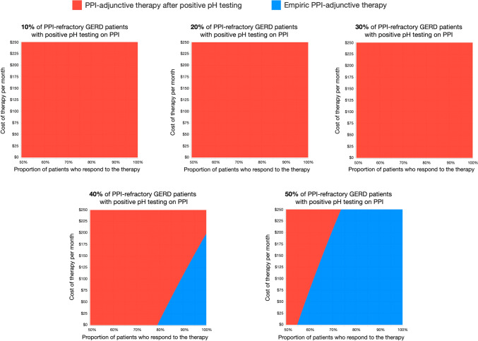 Results: In two-way sensitivity analyses varying the cost and effectiveness of the PPI-adjunctive therapy, most combinations revealed that use of the medication after positive pH testing was the most cost-effective approach. Empiric treatment was the preferred strategy only when the therapy was highly efficacious (≥ 87.5% response rate) and low cost (≤ $109/month). Use of PPI-adjunctive treatments were not cost effective when the cost exceeded $1150/month.