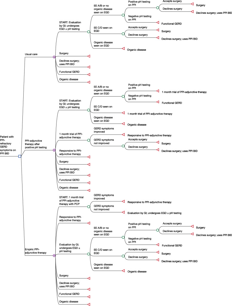 Methods: A Markov decision model was used to examine a hypothetical cohort of patients being evaluated for PPI-refractory GERD in the USA. The model compared 3 strategies: (1) usual care (i.e., upfront diagnostic testing with upper endoscopy ± ambulatory pH testing); (2) use of a PPI-adjunctive therapy after positive ambulatory pH testing; and (3) empiric use of a PPI-adjunctive therapy (i.e., diagnostic testing only after failing empiric treatment). The primary outcome was incremental cost per quality-adjusted life year (QALY) gained (third-party payer perspective) over a 10-year time horizon using a willingness to pay threshold of $100,000/QALY.