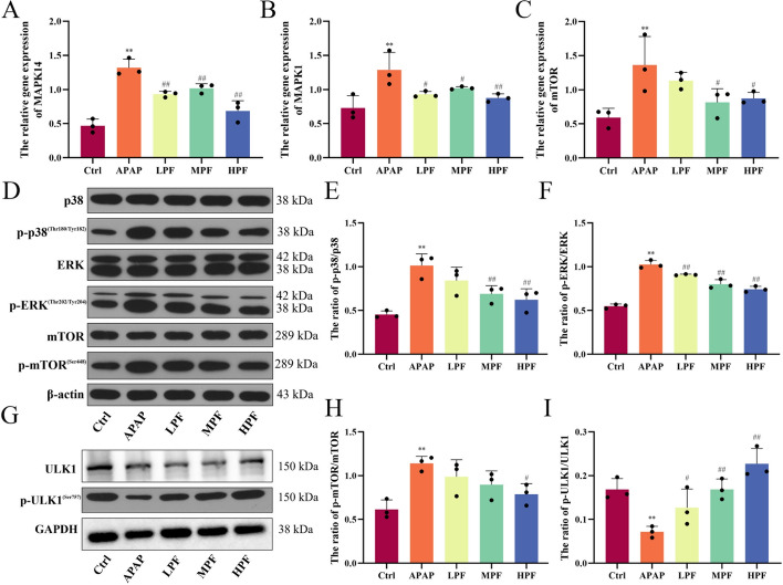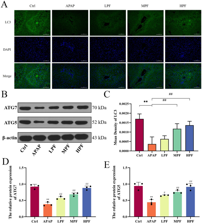 Results: The results demonstrated that serum levels of ALP, γ-GT, AST, TBIL, and ALT were decreased in APAP mice by the preventive effects of PF. Moreover, PF notably alleviated hepatic tissue inflammation and edema. Meanwhile, the results of TUNEL staining and related apoptotic factors coincided with the results of transcriptomics, suggesting that PF inhibited hepatocyte apoptosis by regulated MAPK signaling. Besides, PF also acted on reactive oxygen species (ROS) to regulate the oxidative stress for recovery the damaged mitochondria. More importantly, transmission electron microscopy showed the generation of autophagosomes after PF treatment, and PF was also downregulated mTOR and upregulated the expression of autophagy markers such as ATG5, ATG7, and BECN1 at the mRNA level and LC3, p62, ATG5, and ATG7 at the protein level, implying that the process by which PF exerted its effects was accompanied by the occurrence of autophagy. In addition, combinined with molecular dynamics simulations and western blotting of MAPK, the results suggested p38 as a direct target for PF on APAP. Specifically, PF-activated autophagy through the downregulation of MAPK/mTOR signaling, which in turn reduced APAP injury.