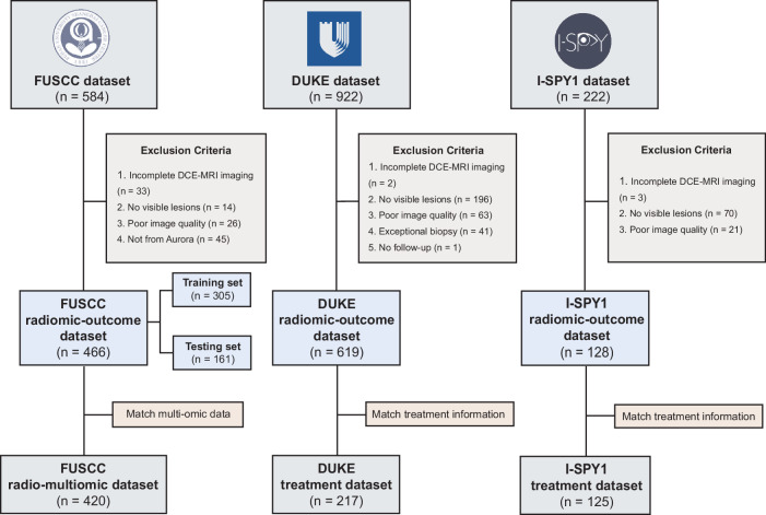 Radiomics offers a noninvasive avenue for predicting clinicopathological factors. However, thorough investigations into a robust breast cancer outcome-predicting model and its biological significance remain limited. This study develops a robust radiomic model for prognosis prediction, and further excavates its biological foundation and transferring prediction performance. We retrospectively collected preoperative dynamic contrast-enhanced MRI data from three distinct breast cancer patient cohorts. In FUSCC cohort (n = 466), Lasso was used to select features correlated with patient prognosis and multivariate Cox regression was utilized to integrate these features and build the radiomic risk model, while multiomic analysis was conducted to investigate the model's biological implications. DUKE cohort (n = 619) and I-SPY1 cohort (n = 128) were used to test the performance of the radiomic signature in outcome prediction. A thirteen-feature radiomic signature was identified in the FUSCC cohort training set and validated in the FUSCC cohort testing set, DUKE cohort and I-SPY1 cohort for predicting relapse-free survival (RFS) and overall survival (OS) (RFS: p = 0.013, p = 0.024 and p = 0.035; OS: p = 0.036, p = 0.005 and p = 0.027 in the three cohorts). Multiomic analysis uncovered metabolic dysregulation underlying the radiomic signature (ATP metabolic process: NES = 1.84, p-adjust = 0.02; cholesterol biosynthesis: NES = 1.79, p-adjust = 0.01). Regarding the therapeutic implications, the radiomic signature exhibited value when combining clinical factors for predicting the pathological complete response to neoadjuvant chemotherapy (DUKE cohort, AUC = 0.72; I-SPY1 cohort, AUC = 0.73). In conclusion, our study identified a breast cancer outcome-predicting radiomic signature in a multicenter radio-multiomic study, along with its correlations with multiomic features in prognostic risk assessment, laying the groundwork for future prospective clinical trials in personalized risk stratification and precision therapy.
