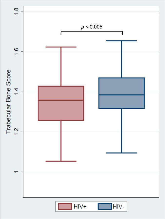 Conclusion: Patients with HIV infection have a significant reduction of TBS, a texture parameter related to bone microarchitecture that may provide skeletal information that is not captured from the standard BMD measurement.
