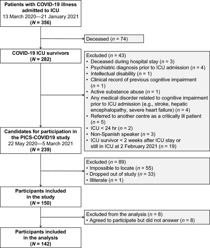 Conclusions: Postintensive care syndrome was common in COVID-19 critical illness survivors and persisted in a significant proportion of patients one year after ICU discharge, impacting HRQoL. The presence of risk factors for PICS may identify patients who are more likely to develop the condition and who would benefit from more specific and closer follow-up after ICU admission.