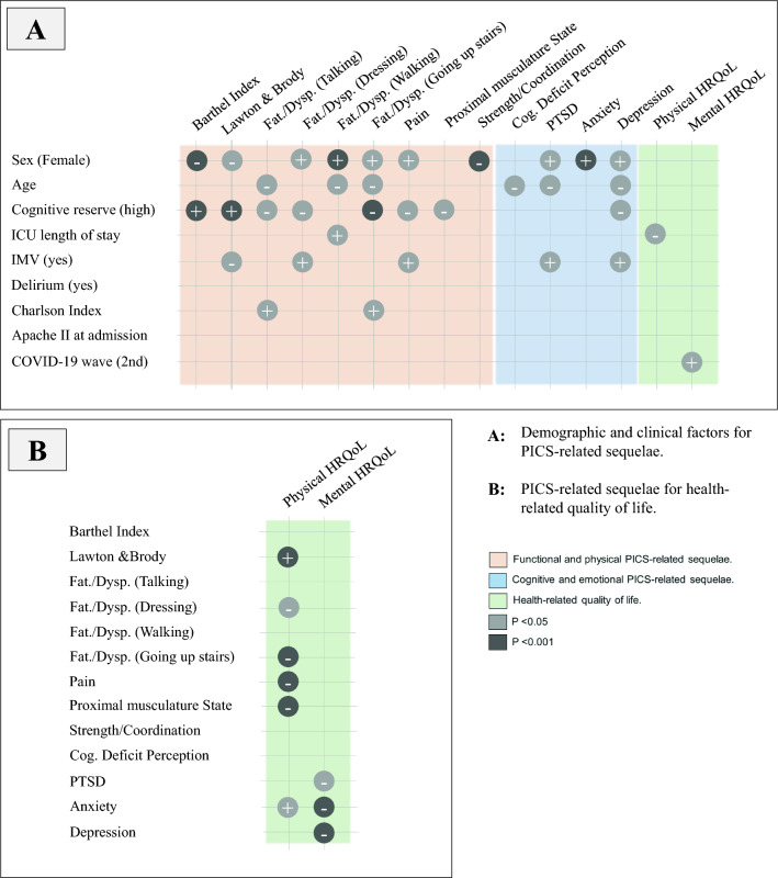 Results: We included 142 study participants in the final analysis, with a median [interquartile range] age of 61 [53-68] yr; 35% were female and 59% needed IMV. Fatigue/dyspnea, pain, impaired muscle function, psychiatric symptomatology and reduced physical HRQoL were prominent sequelae early after ICU discharge. Over the 12-month follow-up, functionality and fatigue/dyspnea improved progressively, while pain remained stable. We observed slight fluctuations in anxiety symptoms and perception of cognitive deficit, whereas posttraumatic stress disorder (PTSD) and depressive symptoms improved, with a mild rebound at the end of the follow-up. Female sex, younger age, and the need for IMV were risk factors for PICS, while having higher cognitive reserve was a potential protective factor. Physical HRQoL scores showed a general improvement over time, whereas mental HRQoL remained stable. Shorter ICU stay, better functionality, and lower scores for fatigue/dyspnea and pain were associated with better physical HRQoL, while lower scores for anxiety, depression, and PTSD were associated with better mental HRQoL.
