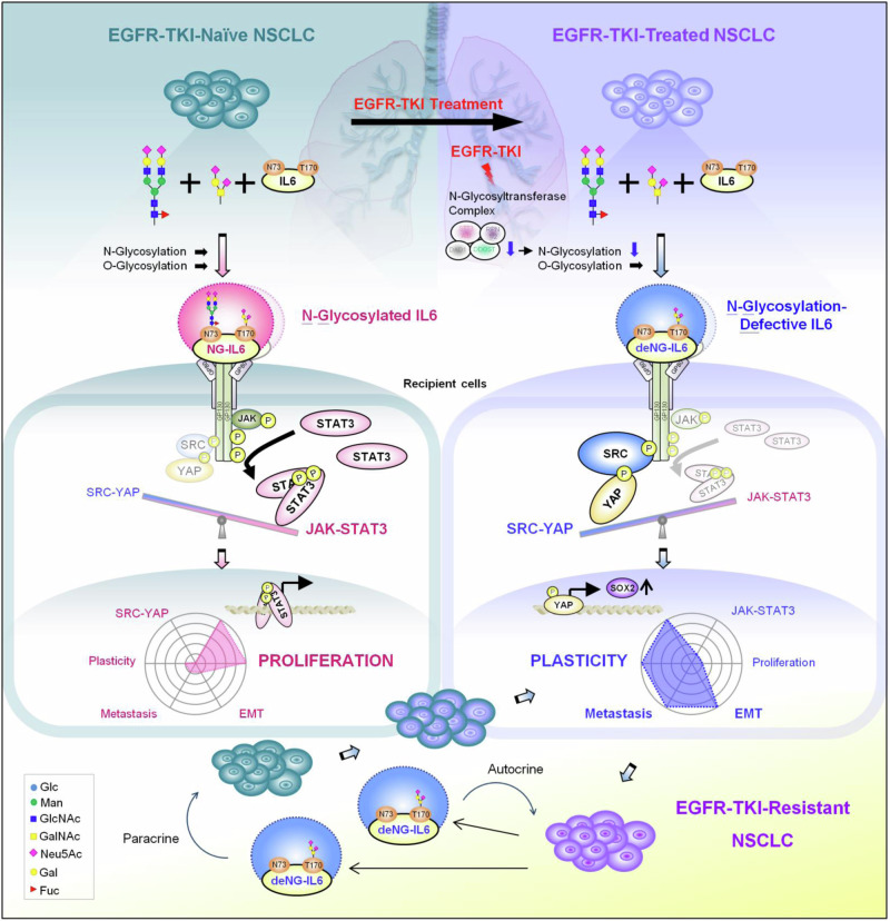 The IL6-GP130-STAT3 pathway facilitates lung cancer progression and resistance to tyrosine kinase inhibitors. Although glycosylation alters the stability of GP130, its effect on the ligand IL6 remains unclear. We herein find that N-glycosylated IL6, especially at Asn73, primarily stimulates JAK-STAT3 signaling and prolongs STAT3 phosphorylation, whereas N-glycosylation-defective IL6 (deNG-IL6) induces shortened STAT3 activation and alters the downstream signaling preference for the SRC-YAP-SOX2 axis. This signaling shift induces epithelial-mesenchymal transition (EMT) and migration in vitro and metastasis in vivo, which are suppressed by targeted inhibitors and shRNAs against SRC, YAP, and SOX2. Osimertinib-resistant lung cancer cells secrete a large amount of deNG-IL6 through reduced N-glycosyltransferase gene expression, leading to clear SRC-YAP activation. deNG-IL6 contributes to drug resistance, as confirmed by in silico analysis of cellular and clinical transcriptomes and signal expression in patient specimens. Therefore, the N-glycosylation status of IL6 not only affects cell behaviors but also shows promise in monitoring the dynamics of lung cancer evolution.