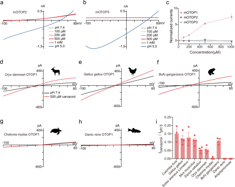 Gating elements for carvacrol activation of the OTOP1 proton channel