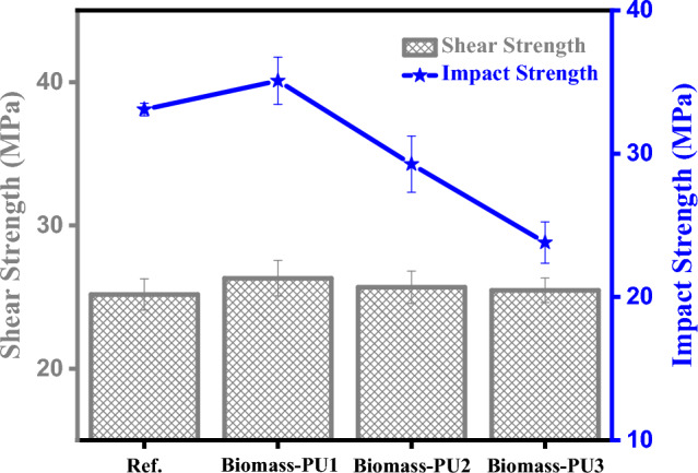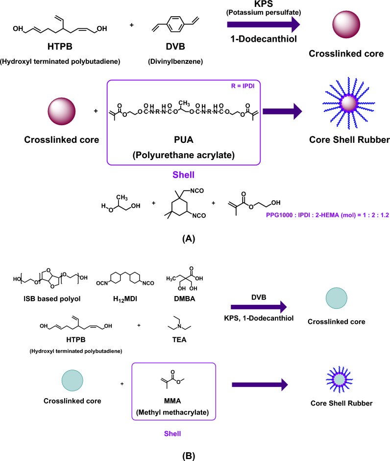 A structural adhesive series of biomass-based polyurethane (Biomass-PU) is synthesized using polypropylene glycol (PPG2000), isosorbide-based polyol (RPO300) as polyols, isophorone diisocyanate (IPDI) as an isocyanate and 4-tert-butylphenol (BP) as a capping agent. Three different equivalent ratios of PPG2000/RPO300, 9/1 (Biomass-PU1), 7/3 (Biomass-PU2), and 1/1 (Biomass-PU3), are evaluated to determine the effect of isosorbide-based polyol content on the properties and the optimizing formulation of biomass-PU structure adhesive. The 9/1 ratio of PPG2000/RPO300 substantially leads to the improvement of impact strength by up to 35 MPa, and the PPG2000/RPO300 = 9/1 ratio exhibits better thermal properties and impact strength than those of other ratios. To achieve more compatibility between biomass-PU structure adhesive and core-shell rubber (CSR) toughener, novel CSRs are successfully synthesized using acryl-PU as a shell and biomass-based PU as a core. The chemical structure of biomass-PU structure adhesives is analyzed through FT-IR Spectroscopy and NCO% titration. Thermal properties are evaluated using TGA and DSC analysis. Their molecular weights are measured by GPC. Also, the core-shell rubber (CSR) with a polyurethane shell is prepared to reinforce the impact strength of Biomass-PU structure adhesive.