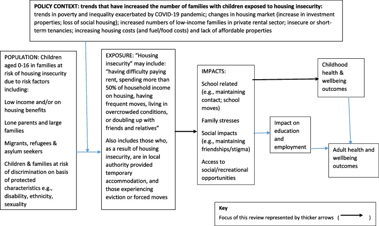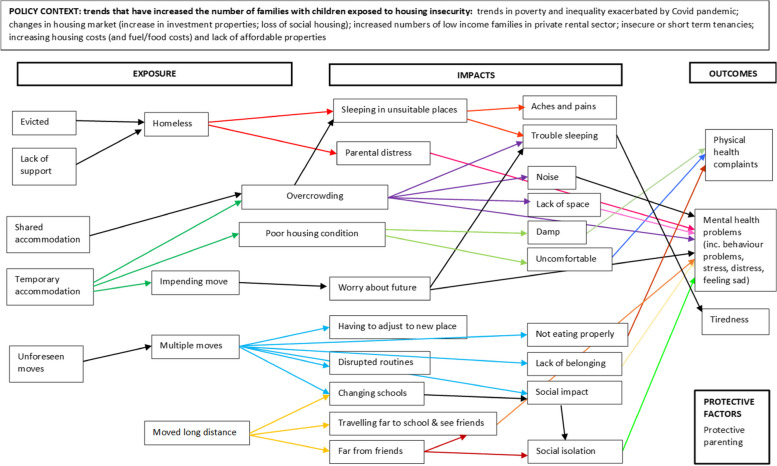 Background: Housing insecurity can be understood as experiencing or being at risk of multiple house moves that are not through choice and related to poverty. Many aspects of housing have all been shown to impact children/young people's health and wellbeing. However, the pathways linking housing and childhood health and wellbeing are complex and poorly understood.