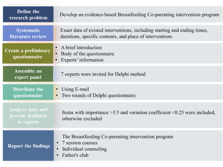Results: Fourteen articles published between 1995 and 2022 were screened. Details of these researches, including starting and ending time, duration and specific contents, were integrated to developed the initial program. Then, six experts completed the two rounds consultation with a positive coefficient of 85.71%, coefficient judgment basis of 0.93, familiarity coefficient of 0.87, authority coefficient of 0.90 and the Kendall's W of 0.62. Finally, an evidence-based breastfeeding co-parenting intervention program was constructed in this study, consisting of breastfeeding co-parenting courses, individual counselling and a father's support group.