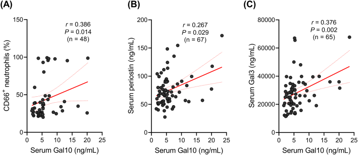 Methods: Sixty-seven asthmatics and 78 healthy controls (HCs) were recruited. Serum Gal10 and Gal3 levels were measured by enzyme-linked immunosorbent assay, and their clinical relevance with inflammatory and lung function parameters was evaluated. Spirometry was performed to assess PAL and small airway dysfunction (SAD). Airway epithelial cells were cocultured with eosinophils/neutrophils, and were exposed to house dust mites to assess the production of Gal10 and Gal3.