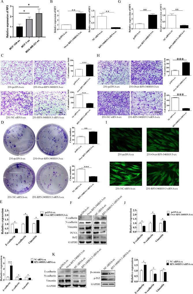 Results: Our investigation revealed that RP3-340B19.3 was expressed in both the cytoplasm and nucleus, with a noteworthy increase in breast cancer cells. Notably, we found that RP3-340B19.3 exerted a promoting influence on the proliferation and migration of breast cancer cells, both in vitro and in vivo. MDA-MB-231-exosomes enriched in RP3-340B19.3 promoted the proliferation and migration of MCF7 and BMMSCs in vitro. Mechanistically, RP3-340B19.3 demonstrated the capability to modulate the expression of MORC4 by forming a complex with miR-4510. This interaction subsequently triggered the activation of the NF-κB and Wnt-β-catenin signaling pathways. Furthermore, our study highlighted the potential diagnostic utility of RP3-340B19.3. We discovered its presence in the serum and exosomes of breast cancer patients, showing promising efficacy as a diagnostic marker. Notably, the diagnostic potential of RP3-340B19.3 was particularly significant in relation to distinguishing between different pathological types of breast cancer and correlating with tumour diameter.