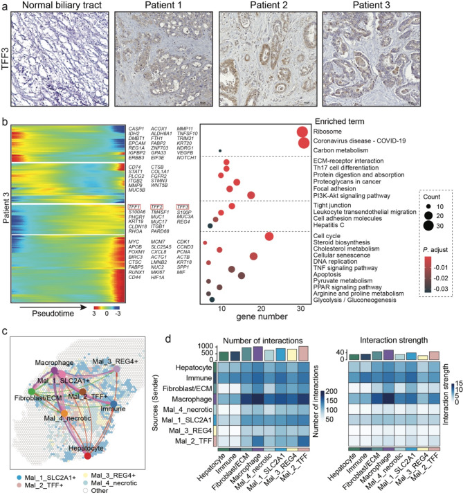 Results: The results reveal that spatial inter- and intra-tumor heterogeneities feature iCCA malignancy, and tumor subclones are mainly driven by physical proximity. Tumor cells with TME components shaped the intra-sectional heterogenetic spatial architecture. Macrophages are the most infiltrated TME component in iCCA. The protein trefoil factor 3 (TFF3) secreted by the malignant subclone can induce macrophages to reprogram to a tumor-promoting state, which in turn contributes to an immune-suppressive environment and boosts tumor progression.