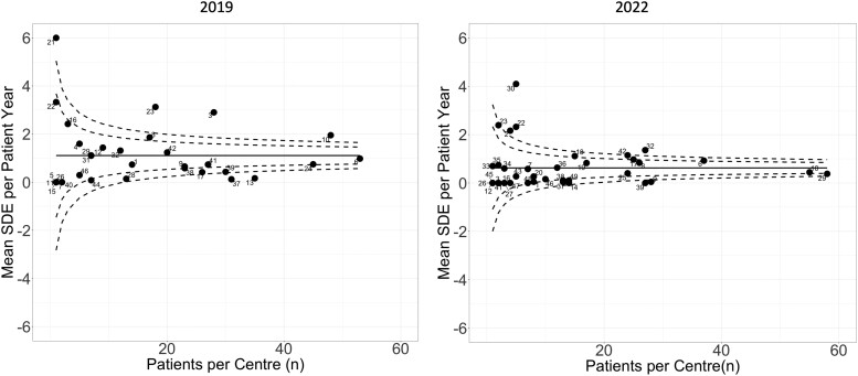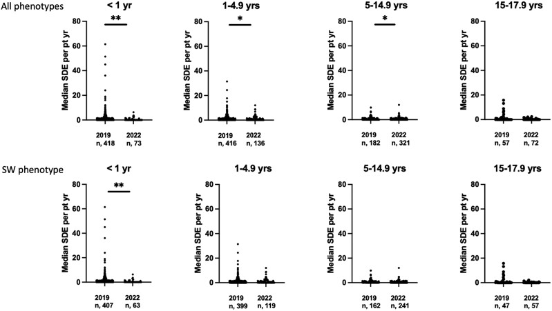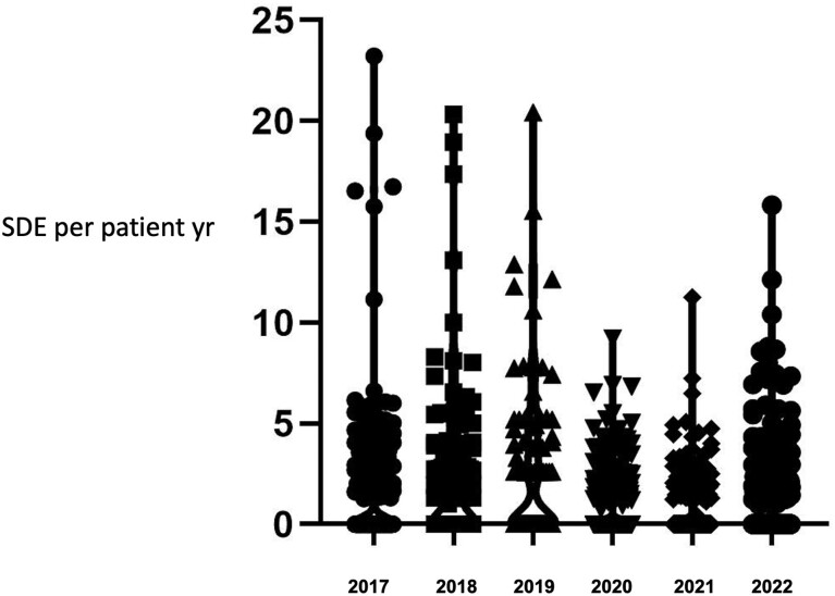 Results: In 2022, a total of 513 children from 38 centers in 21 countries with a median of 8 children (range 1-58) per center had 2470 visits evaluated over a 3-year period (2019-2022). The median SDE per patient year in 2022 was 0 (0-2.5) compared to 0.3 (0-6) in 2019 (P = .01). Despite adjustment for age, CAH phenotype and duration of study period, a difference in SDE rate was still apparent between the 2 cohorts. Of the 38 centers in the 2022 cohort, 21 had also participated in 2019 and a reduction in SDE rate was noted in 13 (62%), an increase was noted in 3 (14%), and in 5 (24%) the rate remained the same. Of the 474 SDEs reported in the 2022 cohort, 103 (22%) led to hospitalization compared to 299 of 1099 SDEs (27%) in the 2019 cohort (P = .02).